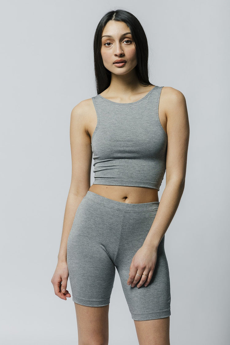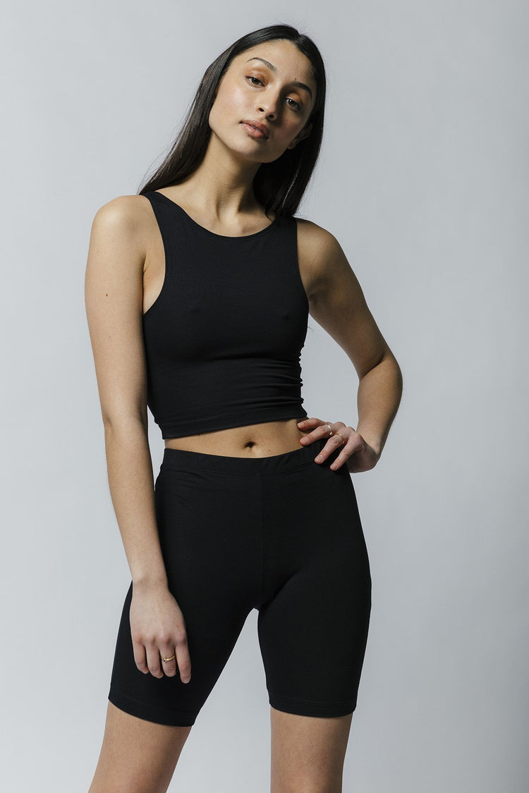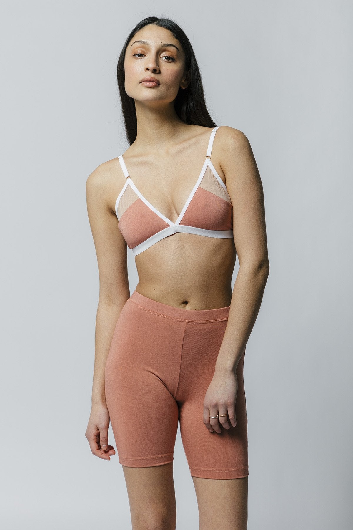 The most comfortable full coverage bra you'll ever wear. The Carter bra features double layer rib knit in black and speckled white in a traditional sports bra shape without the discomfort of a sports bra. The soft elastic band around the ribs will give with wear while the elastic around the neckline and armholes will ensure a secure wear all day long. Featuring a deep scoop in the back along with lower armholes for a more flattering fit.